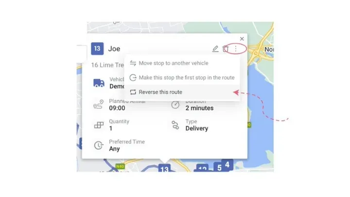 To reverse your route, simply open the ‘stops’ panel and click on the 'three dots' menu located in the top right corner of the screen. From there, you'll see an option to reverse the planned route. Once you've selected this option, the planned route will be reversed and you'll see the new route displayed on the map.