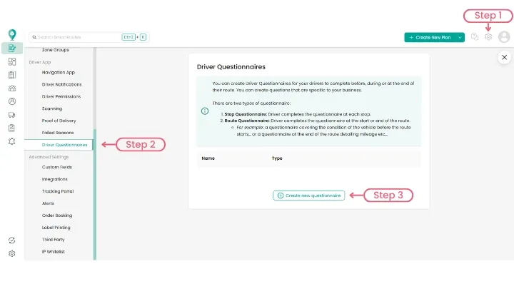 To create a questionnaire in SmartRoutes, go to Settings and select Driver Questionnaires from the left-hand navigation menu. Click Create New Questionnaire.