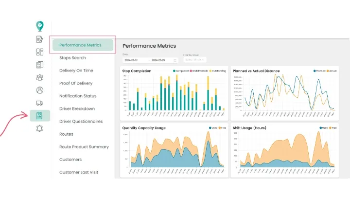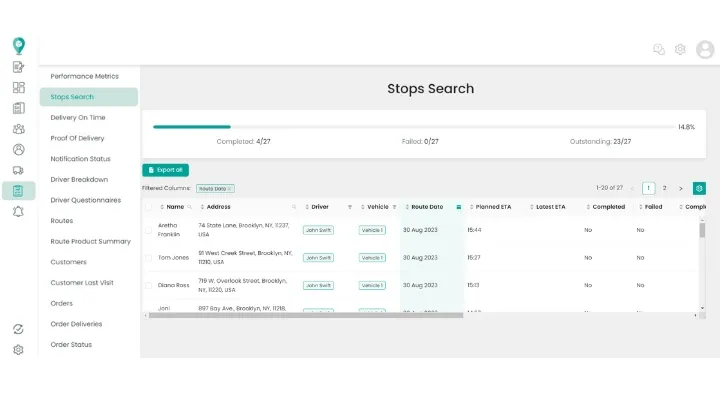 From the ‘Stops’ report, you can view the progress of routes. You can see how many have been completed, failed, and those outstanding. Additionally, you can filter the report by date range, driver, or specific route to get more precise insights into delivery performance. You can also check any specific information regarding each stop, such as timestamps, customer details, and failed reasons.
