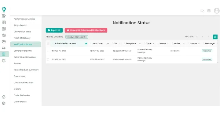 You can check the status of notifications that have been or are yet to be sent. This helps ensure that customers receive timely updates regarding their deliveries.