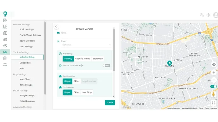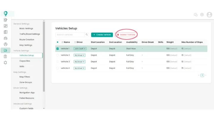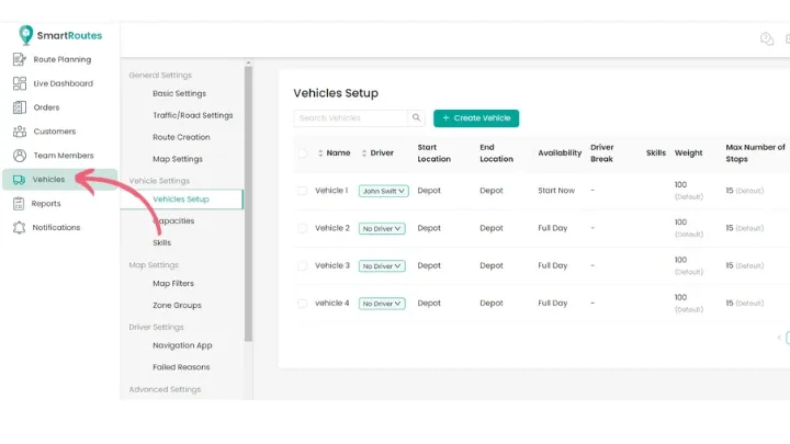 To add a vehicle, click on the button ‘Create Vehicle’. You can then fill out this form with the information related to the new vehicle, Additionally, you can assign a driver to the vehicle, set their availability, and specify any relevant driver skills to ensure efficient fleet management.