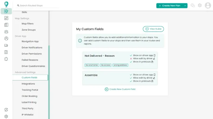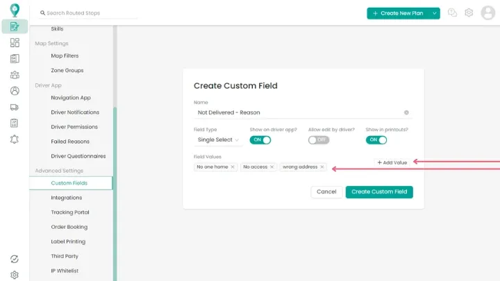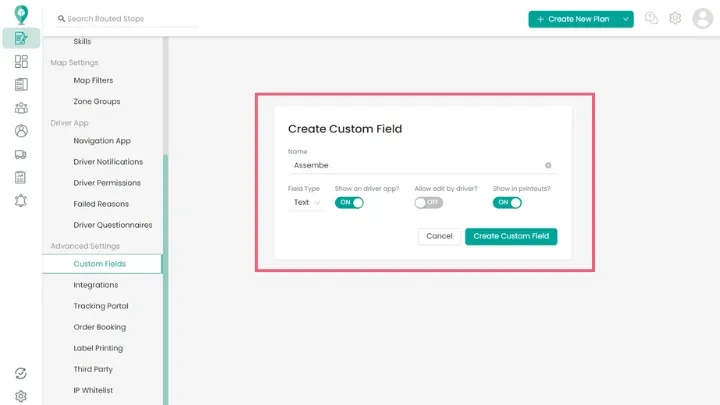 In order to add custom fields, first navigate to the settings page once logged in to your SmartRoutes account. Then click ‘Create New Custom Field’. From here you can input the details of the new custom field you wish to create.
