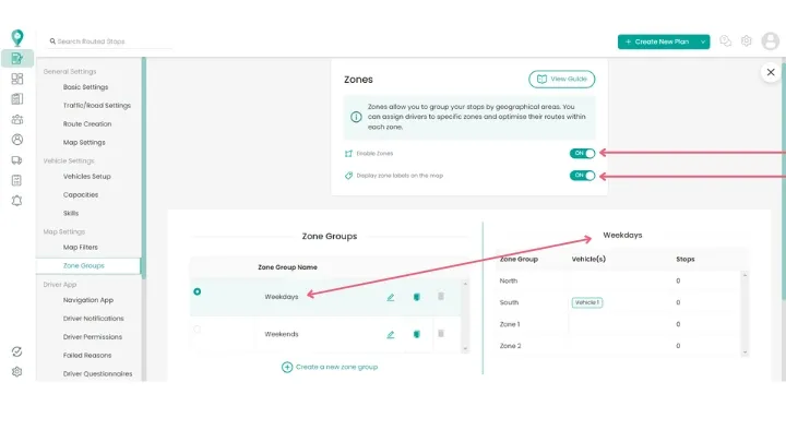 To use zones in SmartRoutes first click on settings in the top right hand corner and toggle ‘Zones (Geographical)’ ON.