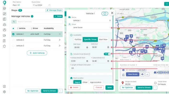 Created the route and realized the driver won't be working that day? You can easily update this by going to 'Manage Vehicles'. Select the driver from the dropdown menu. While you're there, you can also update their hours and add details such as driver breaks.