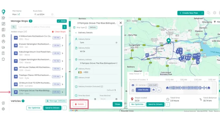 In the example below, stop 21 is significantly farther out of the way compared to the other stops. To optimize the route, we can select this stop from the list and click 'delete'. We can incorporate this stop into a different route later.