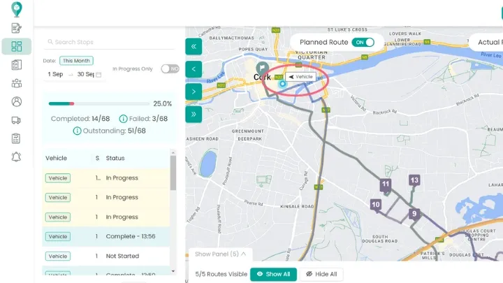 In order to view your driver’s live location, click on the ‘Live Dashbaord’ on the left hand navigation bar. This will give you live route progress as well as the driver's live location.