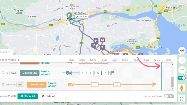 You can also toggle on to view the ‘actual route’ the driver took vs the planned route which can help pinpoint inaccuracies in planning or issues such as detours that may come up that can be avoided in future routes.