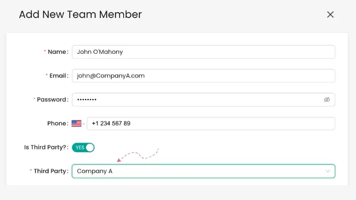- Ensure 'Is this third party?' is toggled 'on' and assign the user to their designated company by selecting their company from the dropdown menu.